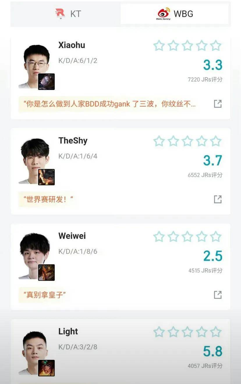 WBG在bo1中连胜两场,对手赛后都表示只要针对shy比赛就赢了大半,团战可以输,shy必须得灰屏!上一场对决小虎与theshy又被推上风口,1-6与6-0,两人都有各自问题,一个后期心态无了,一个玩的太保守,发条拿人头拿经济最后不敢c;整场比赛都没有什么亮眼大招。唯唯诺诺等着别人来无限开。