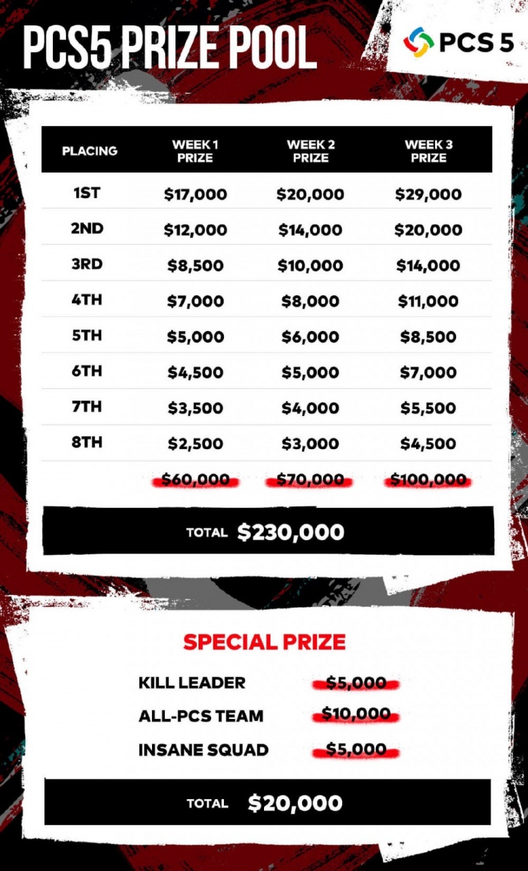 PCS5洲际赛基础总奖金为100万美元,即各赛区25万美元。同样,我们会将PCS5赛事专属道具净销售额的30%与各参赛俱乐部共享。