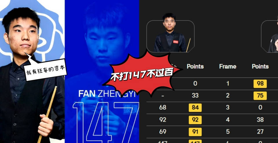 在一个觉醒的时刻,范争一的147杆势必会助力他找回夺冠的状态,也为丁俊晖缺席赛事的遗憾提供了弥补。今年,丁俊晖在沙特大师赛因失误止步资格赛,并且因报名时间问题未能参与英格兰公开赛,目前在本赛季积分榜上仍然保持零分。但令人欣慰的是,范争一的崛起为中国队注入了新的希望。他曾以“若不打出147就不算数”的狂妄言论引发关注,现在这一目标如梦似幻地成真,令球迷们期待他在职业生涯中获取第二个冠军。